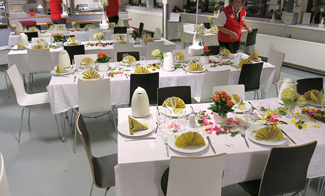 Der forefindes service, køl og kaffemaskine - samt anretterkøkken og komfur til lettere opvarmning.